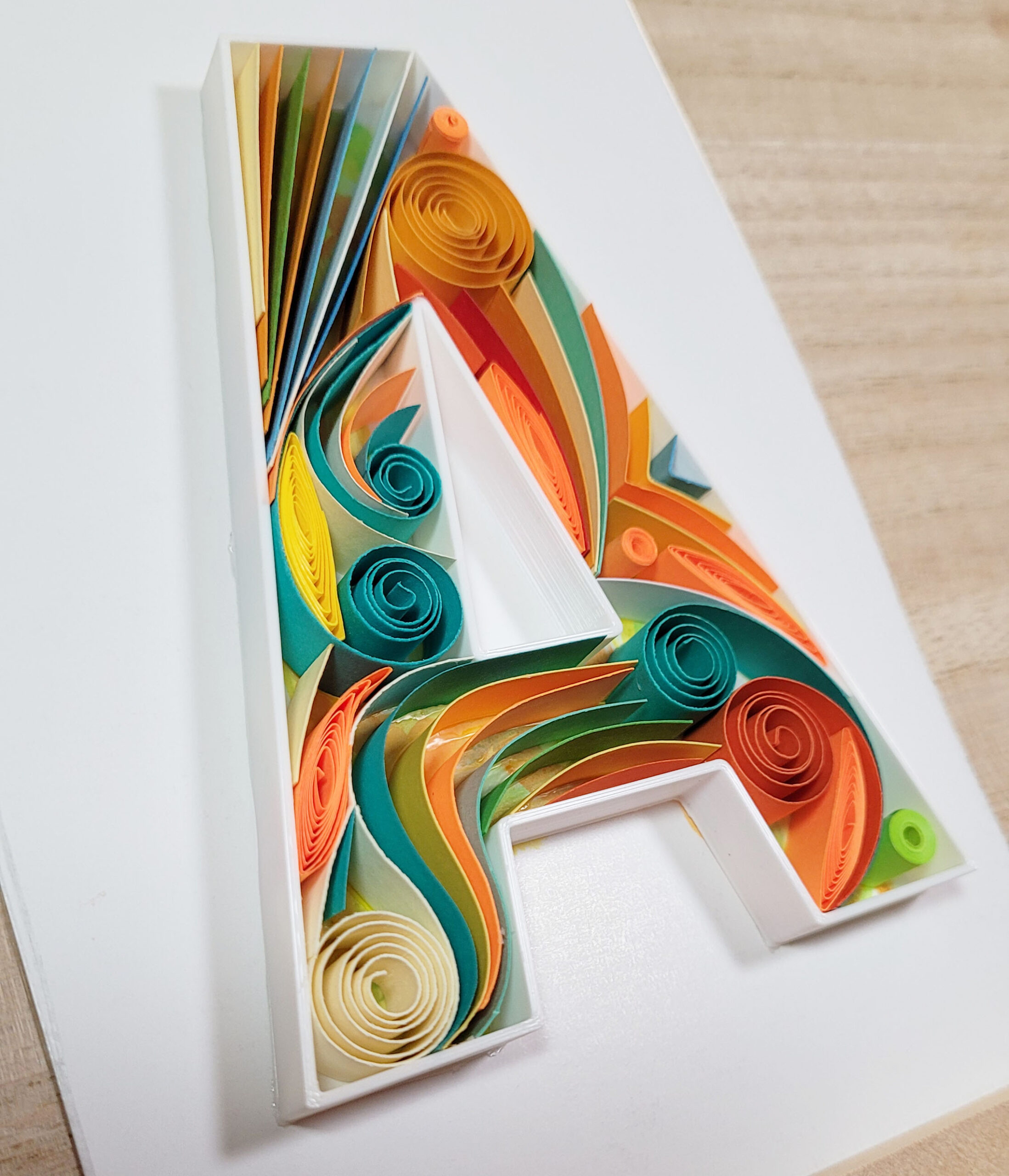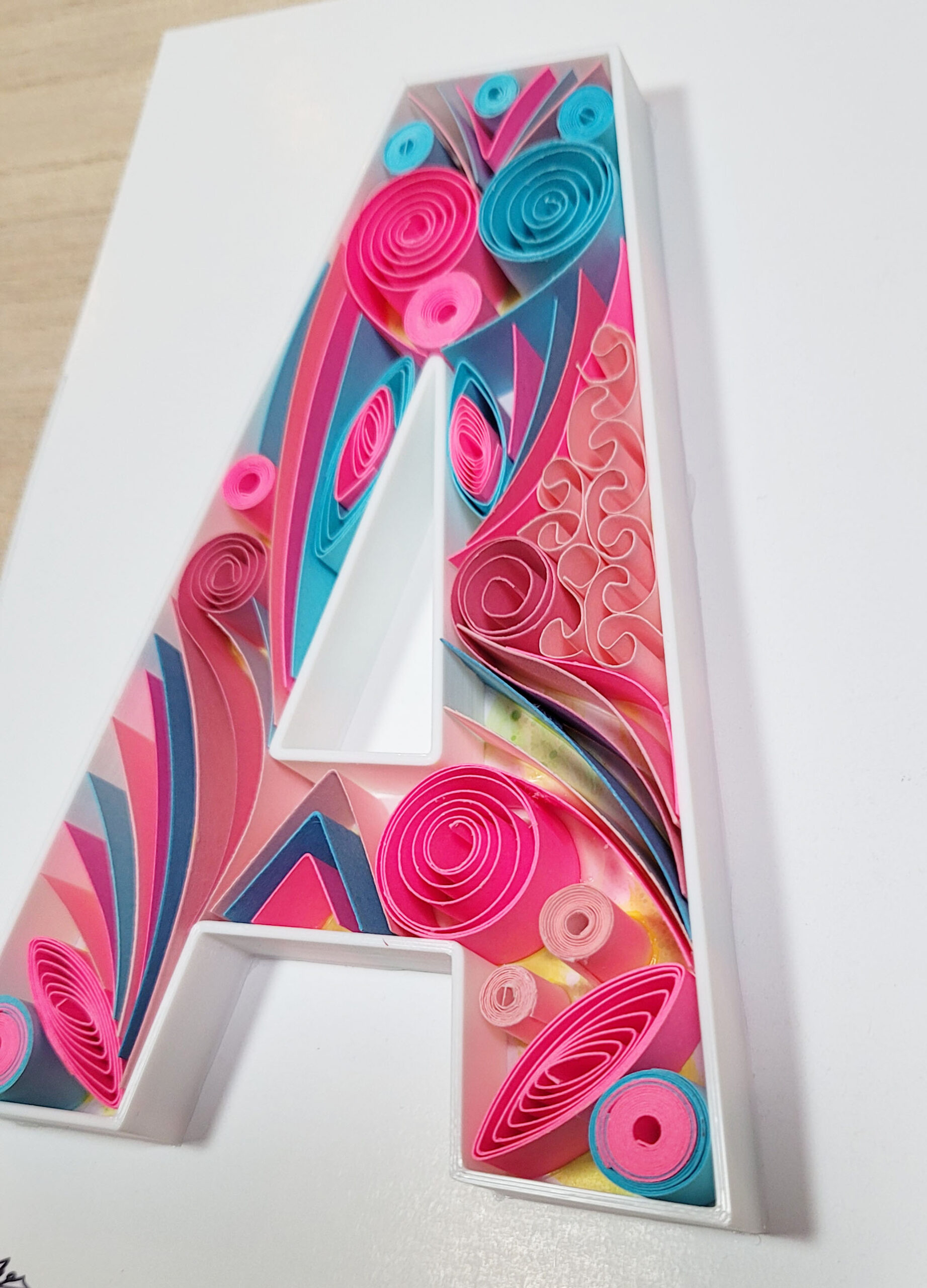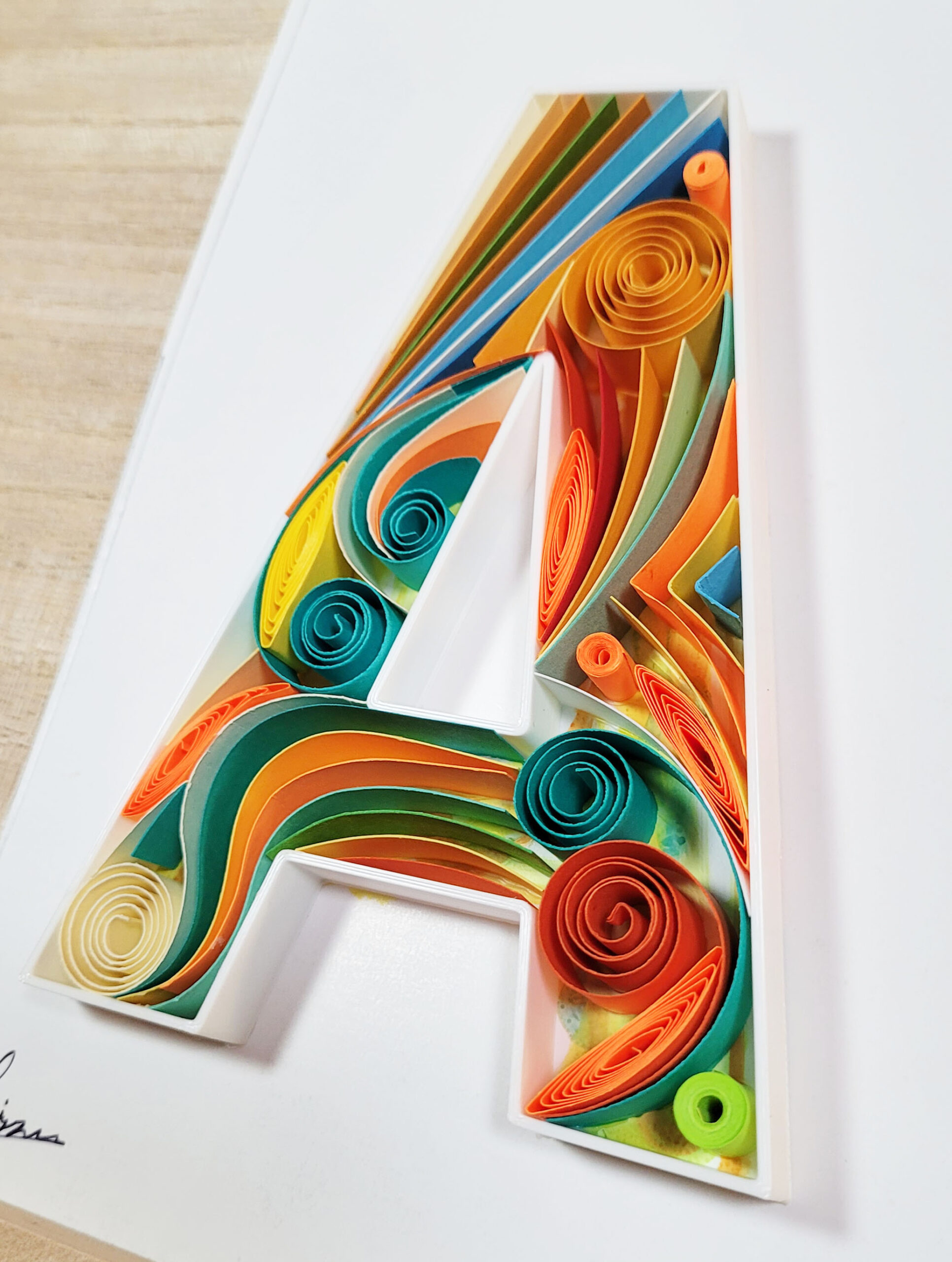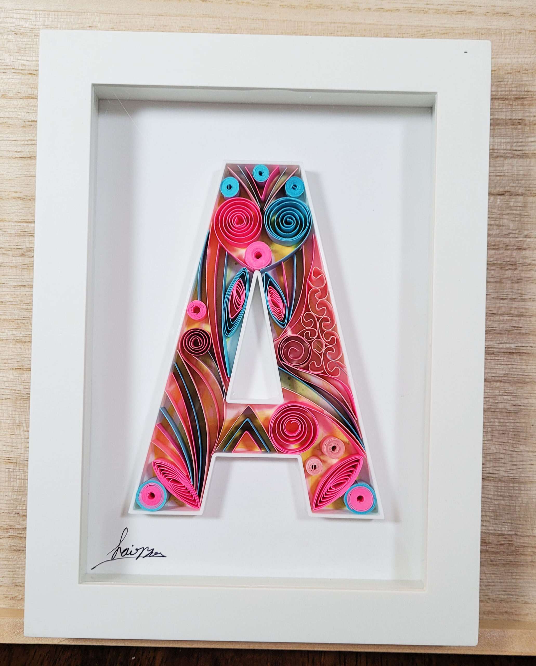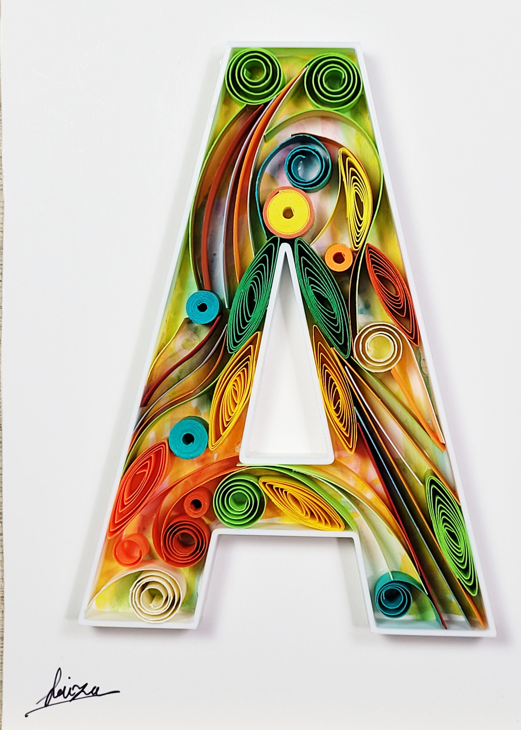 Celebrate the beauty of handmade craftsmanship with this original Letter A wall artwork, created using the timeless art of paper quilling. Strips of colorful paper are carefully rolled, shaped, and glued to form an intricate design that adds depth and elegance to any space.